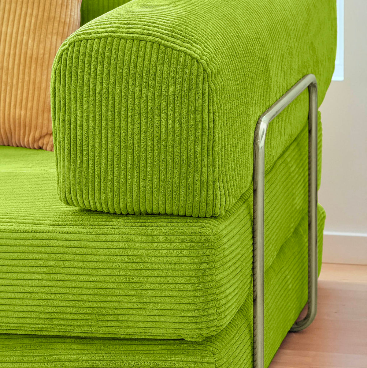 Nova Sofa Bed Eggshell Nova Sofa Bed-Dune Yellow Convertible Sofa Bed - Bright Color Sofa Bed Nova Sofa Bed Marigold Orange sofa with a metal frame on a white background Nova Sofa Bed in Rust – warm earthy tone, minimalist fold-out sofa bed with soft corduroy fabric, perfect for modern interiors