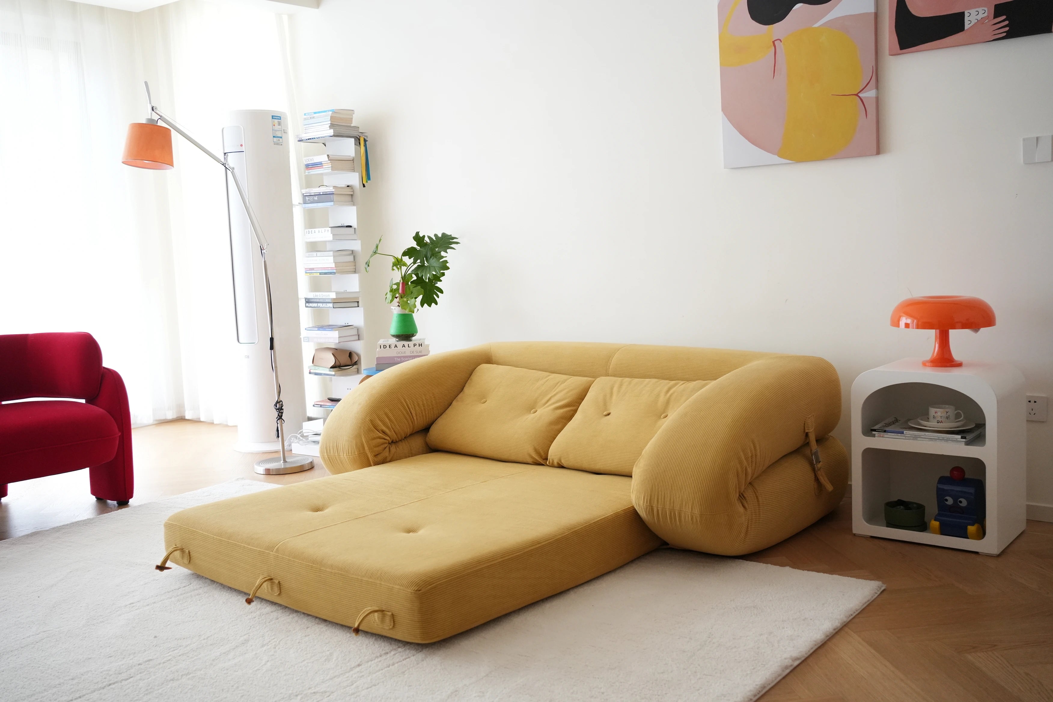 Flippo Sofa Bed in Yellow color – bold sculptural design, soft corduroy fabric, easily converts to bed, modern living room furniture